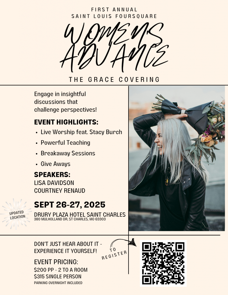 This event has been a couple of years in the making… Covered in prayer… Strategized over… Talked about… Sought after and longed for by pastors and female leaders alike! You may have heard of a woman’s retreat; we call ours an advance because we are ever growing, ever pressing forward, ever changing and ever advancing! This year marks our first St. Louis Foursquare Women’s Advance! If you feel a drop of excitement, it’s probably the Holy Spirit nudging you in this direction! You can register on this page right now! There will be excitement! Prizes given away! Endless coffee to drink. Contemporary worship with encouraging and empowering sessions with the dynamic word given followed by Table Talk on the topic! We will not be short on praying for one another and building one another up! There will be a sleepover, followed by a second session on Saturday morning, that extra one/two punch that we need to take us all the way into our next level of kingdom stuff!